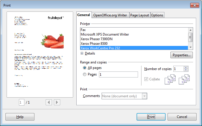An integrated preview is available to show the appearance of the document to be printed, and all relevant settings can be made from within this one dialog, including number of pages, collation settings, document objects to print or hide, page order, print multiple pages, and much more.